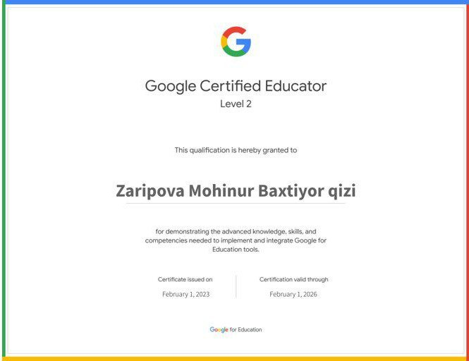 Erishilgan yutuqlar 15-09-2023, 20:06 Informatika va AT fani o'qituvchisi Zaripova Mohinur Baxtiyor qizini erishgan yutuqi
